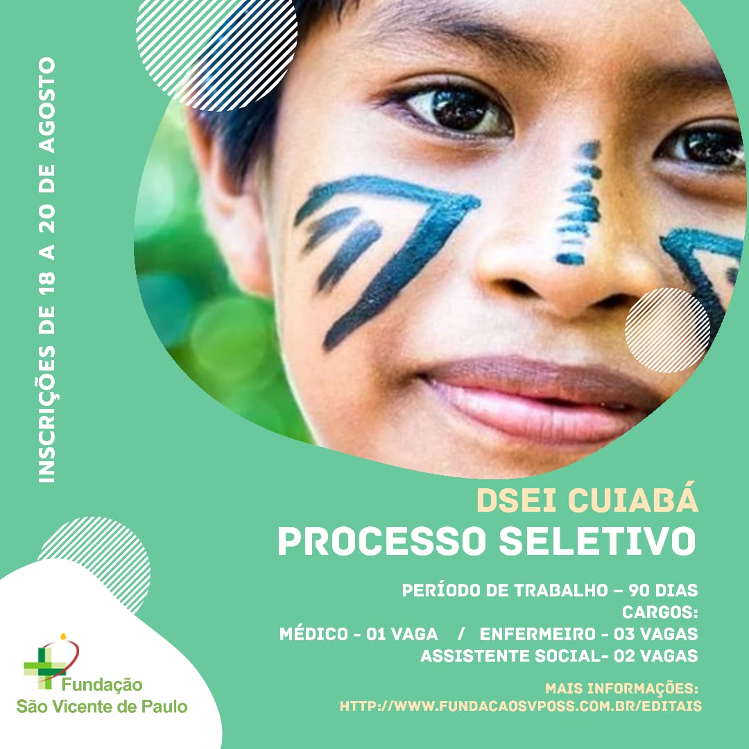 Estão abertas a partir desta terça-feira,18, até o dia 20 de maio, as inscrições do Processo Seletivo (PSS 004/2020) do Distrito Sanitário Especial Indígena (DSEI) Cuiabá (MT) para a contratação de profissionais que farão parte das Equipes Multidisciplinares de Saúde Indígena (EMSI) do DSEI por um período de 90 dias.