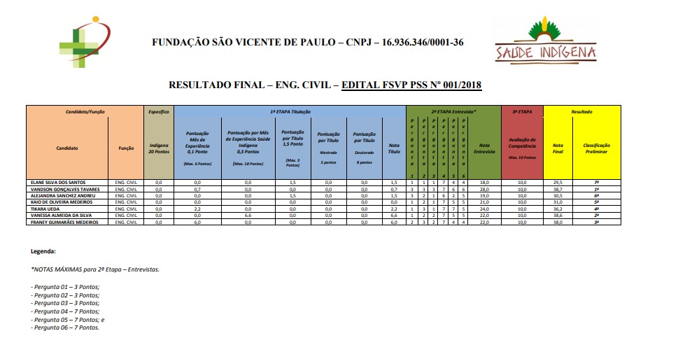 A Fundação São Vicente de Paulo (Paraopeba/MG) realizou a etapa de entrevista com os candidatos ao cargo de Engenheiro Civil no Processo Seletivo Simplificado (PSS) realizado em dezembro de 2018 no Distrito Sanitário Especial Indígena de Alto Rio Negro (DSEI/ ARN) localizado em São Gabriel da Cachoeira na Amazônia.