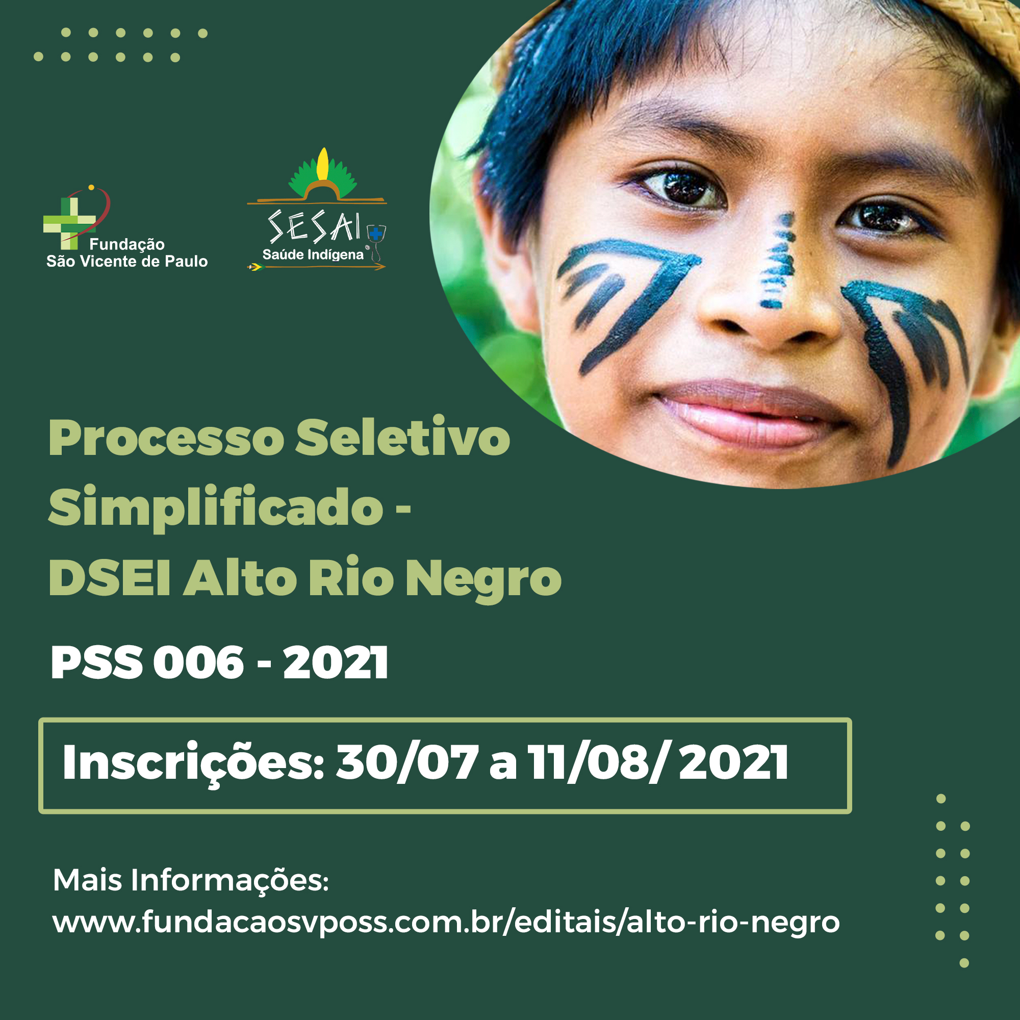 A Fundação São Vicente de Paulo de Paraopeba (MG), conveniada que atua no Distrito Sanitário Especial Indígena (DSEI) Alto Rio Negro, realiza o Processo Seletivo Simplificado para a contratação de profissionais, que irão compor as Equipes Multidisciplinares Especiais (EME) do Distrito. As inscrições podem ser realizadas de 30/07 a 11/08/21, por meio do e-mail pss006.fsvp.arn@gmail.com . Não haverá qualquer recolhimento de taxa de inscrição.