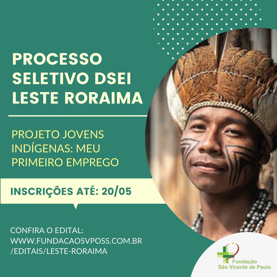 A Fundação São Vicente de Paulo de Paraopeba (MG) deu início ao Processo Seletivo do Distrito Sanitário Especial Indígena (DSEI) Leste Roraima para o “Programa Jovens indígenas: meu primeiro emprego” criado pela Secretaria Especial de Saúde Indígena (Sesai). As inscrições podem ser realizadas até o dia 20/05, através do e-mail: seletivojindigenalrr@gmail.com.