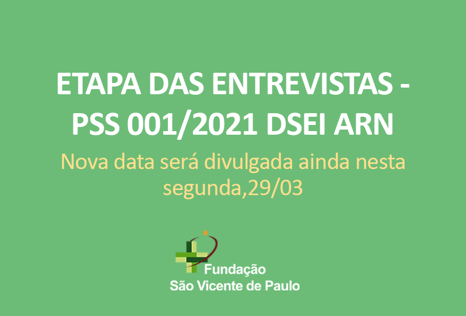 A Fundação São Vicente de Paulo de Paraopeba/MG informa que a etapa de entrevistas do Processo Seletivo do DSEI Alto Rio Negro (PSS 001/2021), prevista para começar nesta segunda-feira, 29, a partir das 14 horas, teve que ser adiada porque alguns dos membros da Comissão Examinadora do PSS estão, desde às 7:00 da manhã, impedidos de voar do aeroporto de Manaus para São Gabriel da Cachoeira, em função do mau tempo.