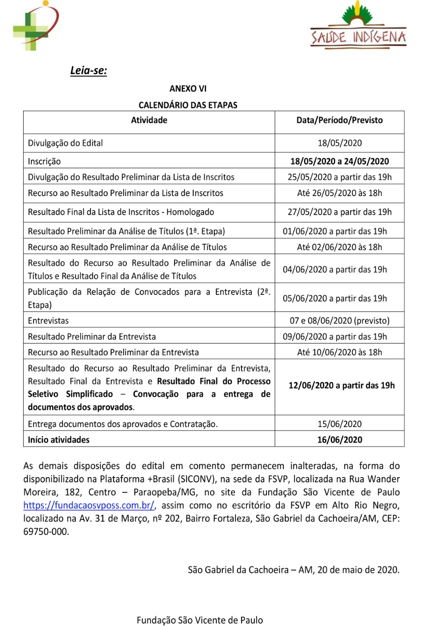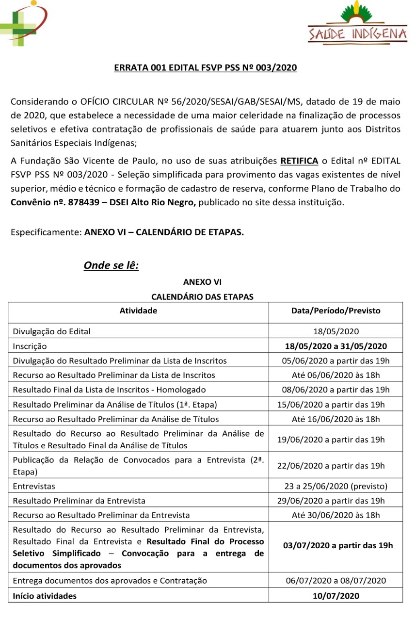 Em virtude da necessidade de uma maior celeridade na finalização de processos seletivos e efetiva contratação de profissionais de saúde para atuarem junto aos Distritos Sanitários Especiais Indígenas, a Fundação São Vicente de Paulo, no uso de suas atribuições, RETIFICA o Edital nº EDITAL FSVP PSS Nº 003/2020  que se refere ao Processo Seletivo Simplificado do DSEI de Alto Rio Negro para o preenchimento das vagas existentes de nível superior, médio e técnico e formação de cadastro de reserva, conforme Plano de Trabalho do Convênio nº. 878439.