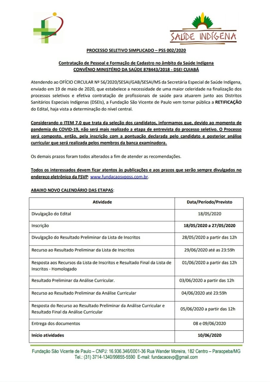 Em virtude da necessidade de uma maior celeridade na finalização de processos seletivos e efetiva contratação de profissionais de saúde para atuarem junto aos Distritos Sanitários Especiais Indígenas, a Fundação São Vicente de Paulo, no uso de suas atribuições, RETIFICA o Edital nº EDITAL FSVP PSS Nº 003/2020  que consiste no Processo Seletivo Simplificado do DSEI Cuiabá para o preenchimento das vagas existentes de nível superior, médio e técnico e formação de cadastro de reserva, conforme Plano de Trabalho do Convênio nº. 878439.