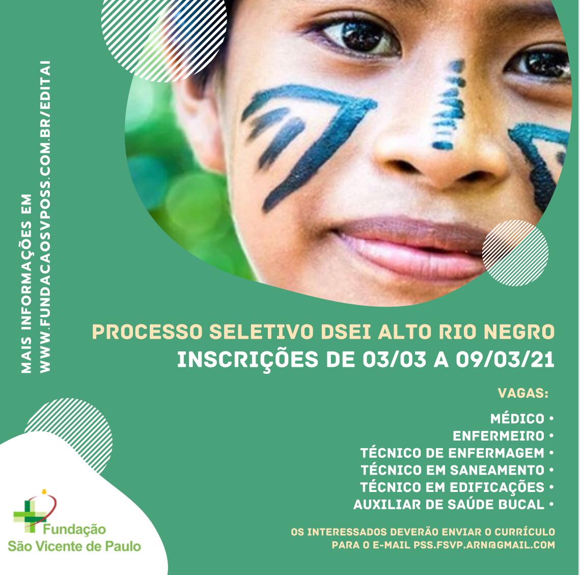 A Fundação São Vicente de Paulo de Paraopeba (MG) iniciou nesta quarta-feira,03, as inscrições do Processo Seletivo Simplificado que irá selecionar profissionais para o Distrito Sanitário Especial Indígena Alto Rio Negro (DSEI-ARN), em São Gabriel da Cachoeira (AM). Os interessados poderão se inscrever até o dia 09/03/21.