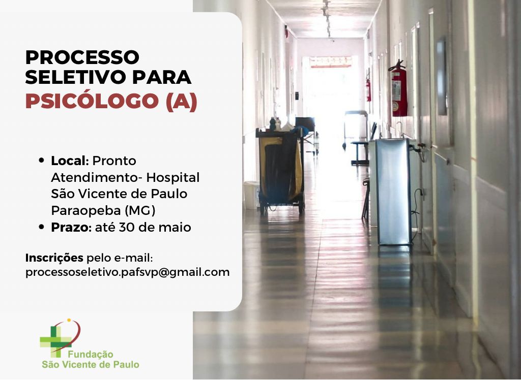 A Fundação São Vicente de Paulo (FSVP), de Paraopeba (MG), iniciou nesta quarta-feira, 18, o processo seletivo para a contratação imediata e formação de cadastro reserva para profissionais de psicologia. Os interessados têm até o dia 30 de maio para enviar o currículo para o e-mail: processoseletivo.pafsvp@gmail.com.