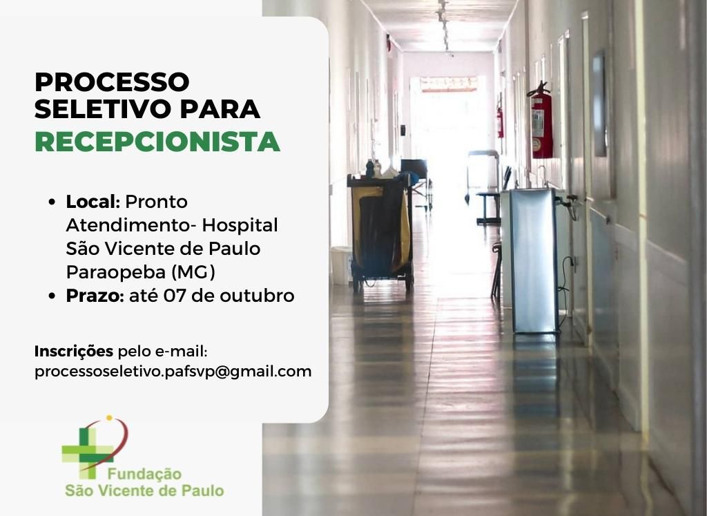 O Pronto Atendimento do Hospital São Vicente de Paulo, de Paraopeba (MG), deu início nesta segunda-feira, 03, ao Processo Seletivo para contratação imediata e formação de cadastro reserva para vaga de Recepcionista.