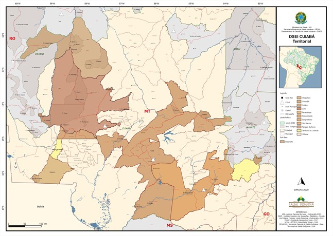 O Distrito Sanitário Especial Saúde Indígena Cuiabá tem atualmente a população de 6.866 (seis mil oitocentos e sessenta e seis) indígenas, em 122 (cento e vinte e duas) aldeias, dispersas em 23 terras indígenas, no estado de Mato Grosso com acesso que utiliza os modais terrestre fluvial, totalizando uma extensão territorial: 2.301.034,77 (dois milhões trezentos e um mil trinta e quatro e sessenta e sete) hectares.