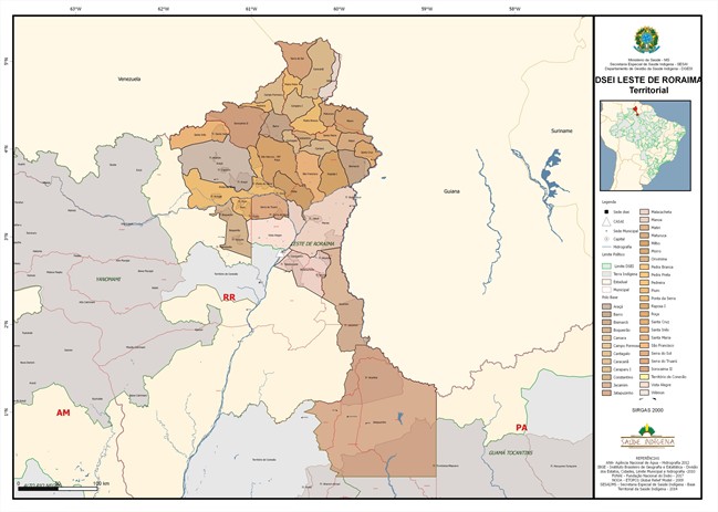O Distrito Sanitário Especial Indígena do Leste de Roraima é responsável pela atenção básica à saúde dos povos indígenas Macuxi, Wapichana, Ingarikó, Patamona, Taurepang, Sapará e Wai-Wai, vivendo em 321 aldeias com uma população total de 48.906 habitantes (Censo Demográfico ajustado para junho de 2017). Para fins assistenciais estão divididos em 34 polos-base e onze regiões geográficas - Serras, Surumu, Baixo Cotingo, Raposa, Amajari, Taiano, Murupu, Serra da Lua, Ingarikó e Wai-Wai. Estão distribuídos em 32 Terras Indígenas que atualmente se estendem pelo território de onze municípios - Boa Vista, Alto Alegre, Amajari, Bonfim, Cantá, Normandia, Pacaraima, Uiramutã, São João da Baliza, São Luís do Anauá e Caroebe, com uma extensão territorial de 3.912.959 hectares, dispersas pela metade do estado de Roraima.